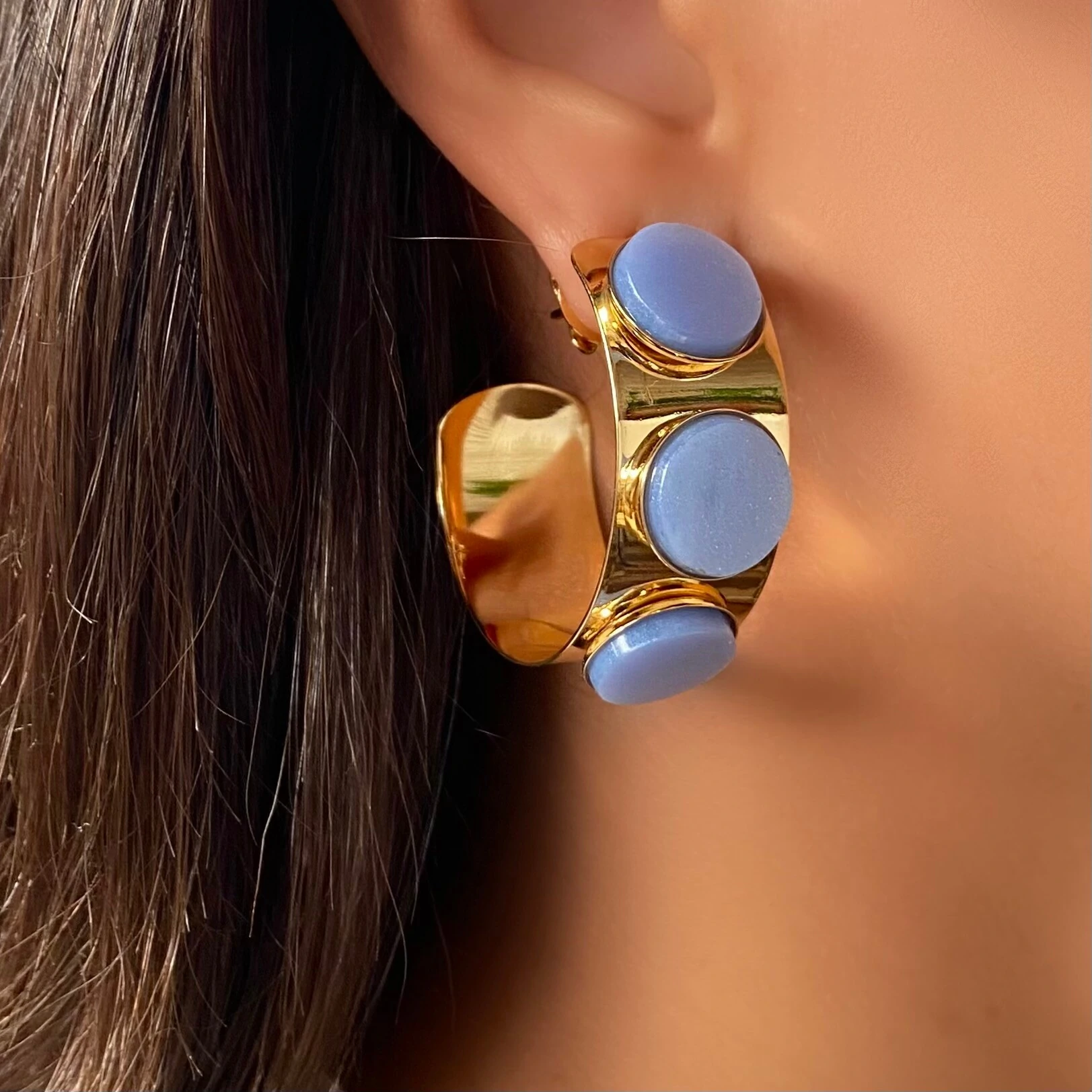 BRINCO NO BANHO OURO 18K, COM RESINA AZUL CELESTE.