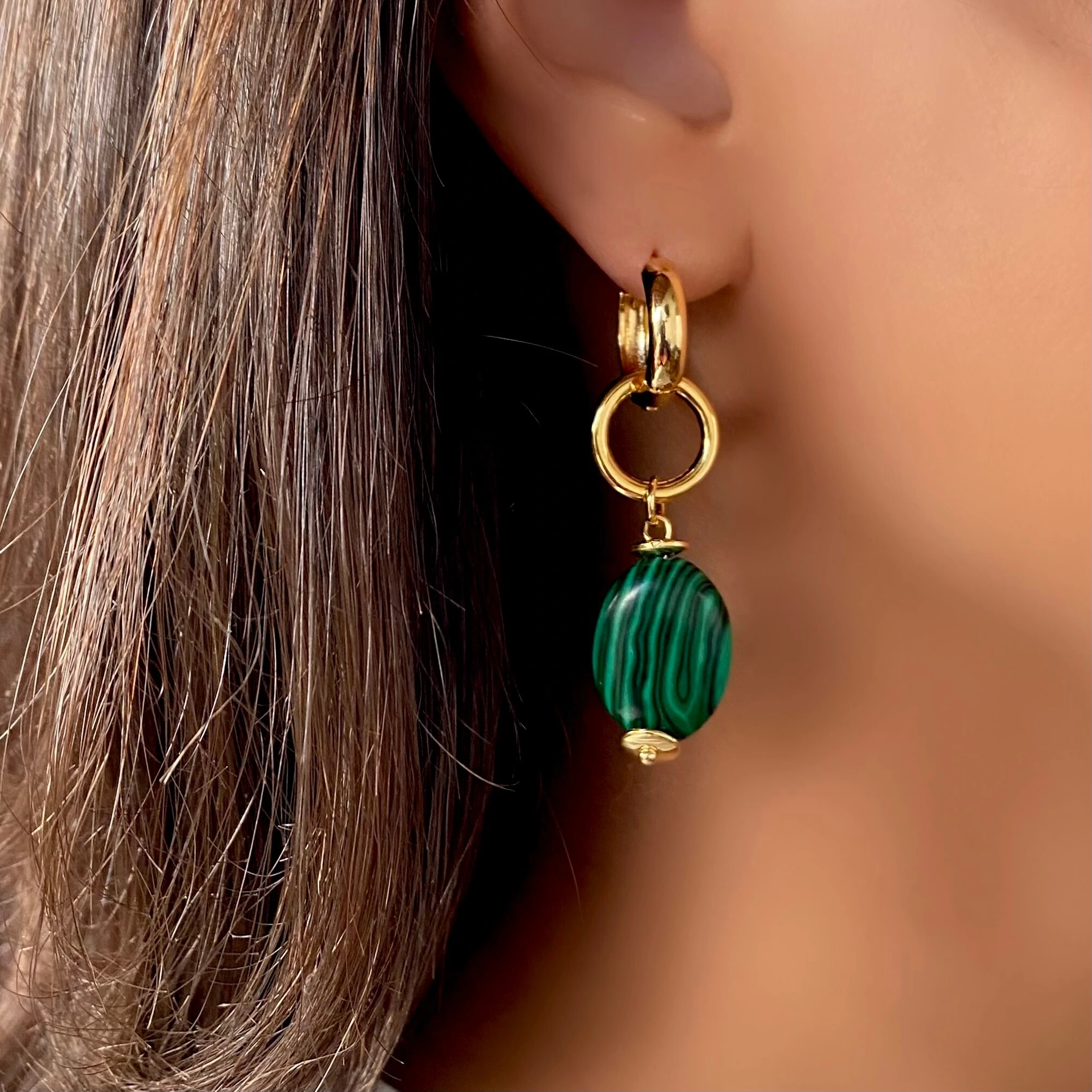 BRINCO NO BANHO OURO 18K, COM PEDRA NATURAL MALAQUITA.