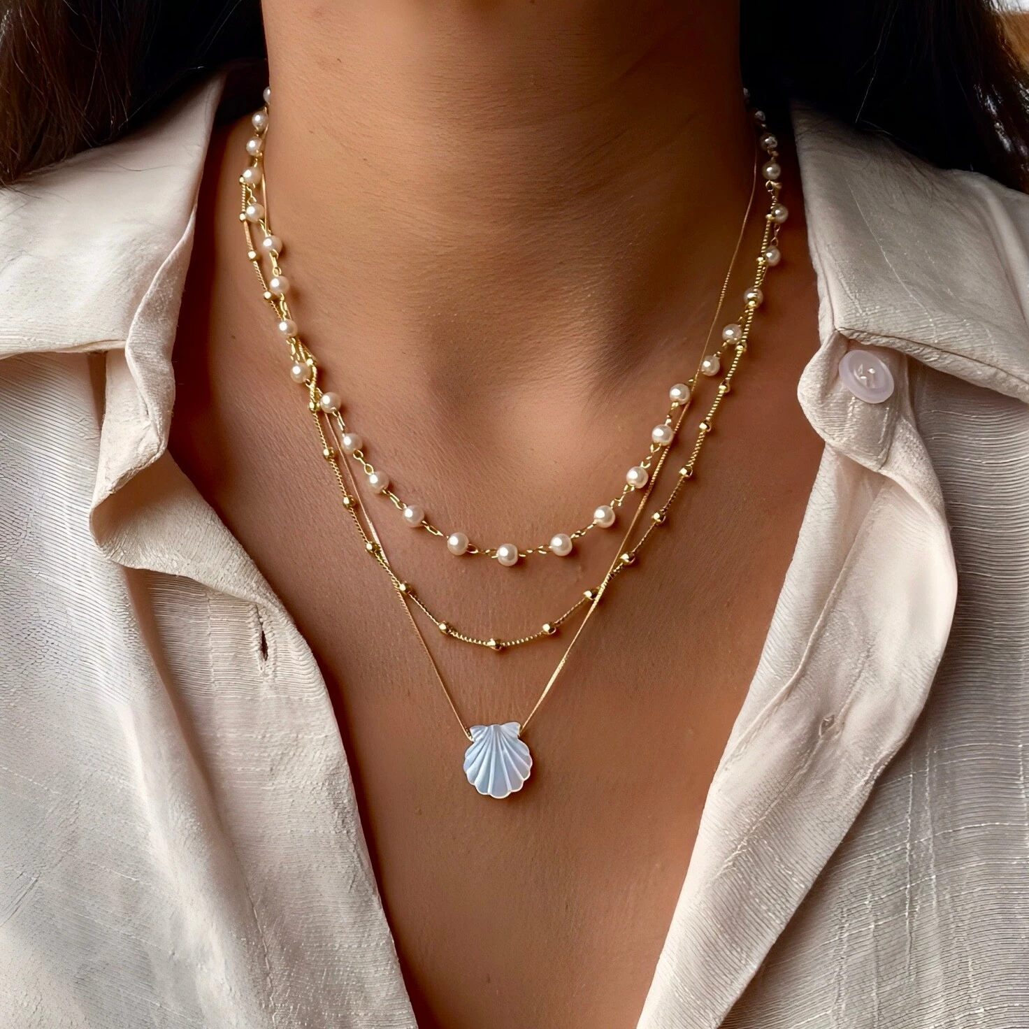 COLAR NO BANHO OURO 18K, COM PÉROLA SINTÉTICA E MADREPÉROLA NATURAL.