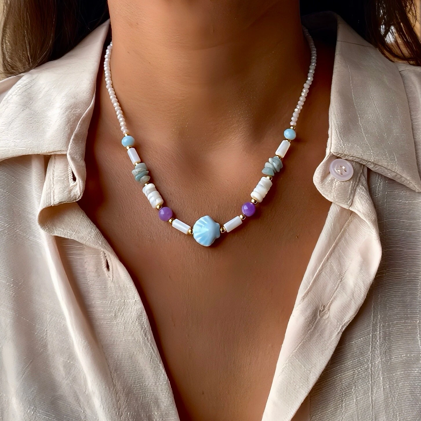 COLAR NO BANHO OURO 18K, COM MADREPÉROLA, CRISTAL E PEDRA NATURAL.