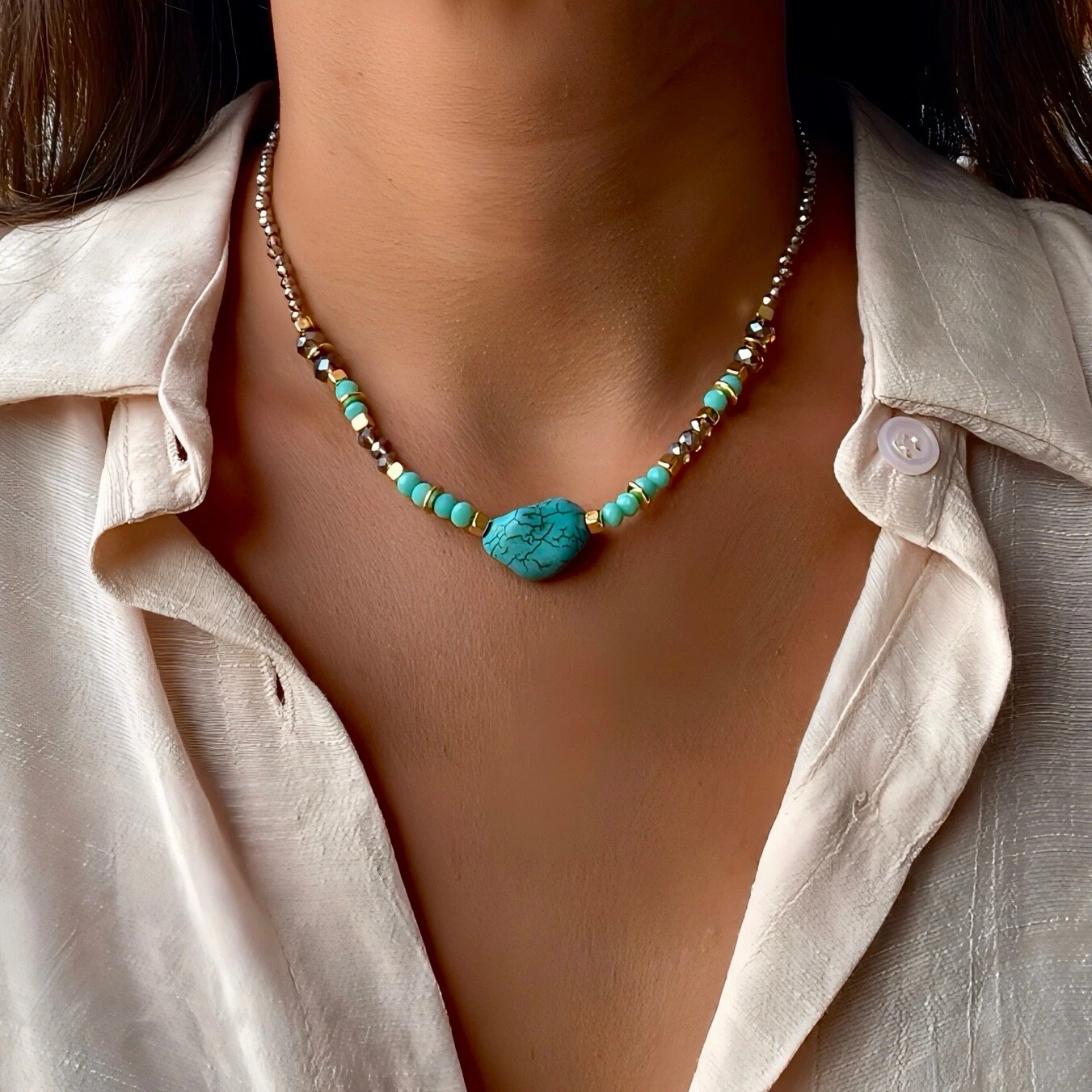 COLAR NO BANHO OURO 18K, COM CRISTAL E PEDRA NATURAL.