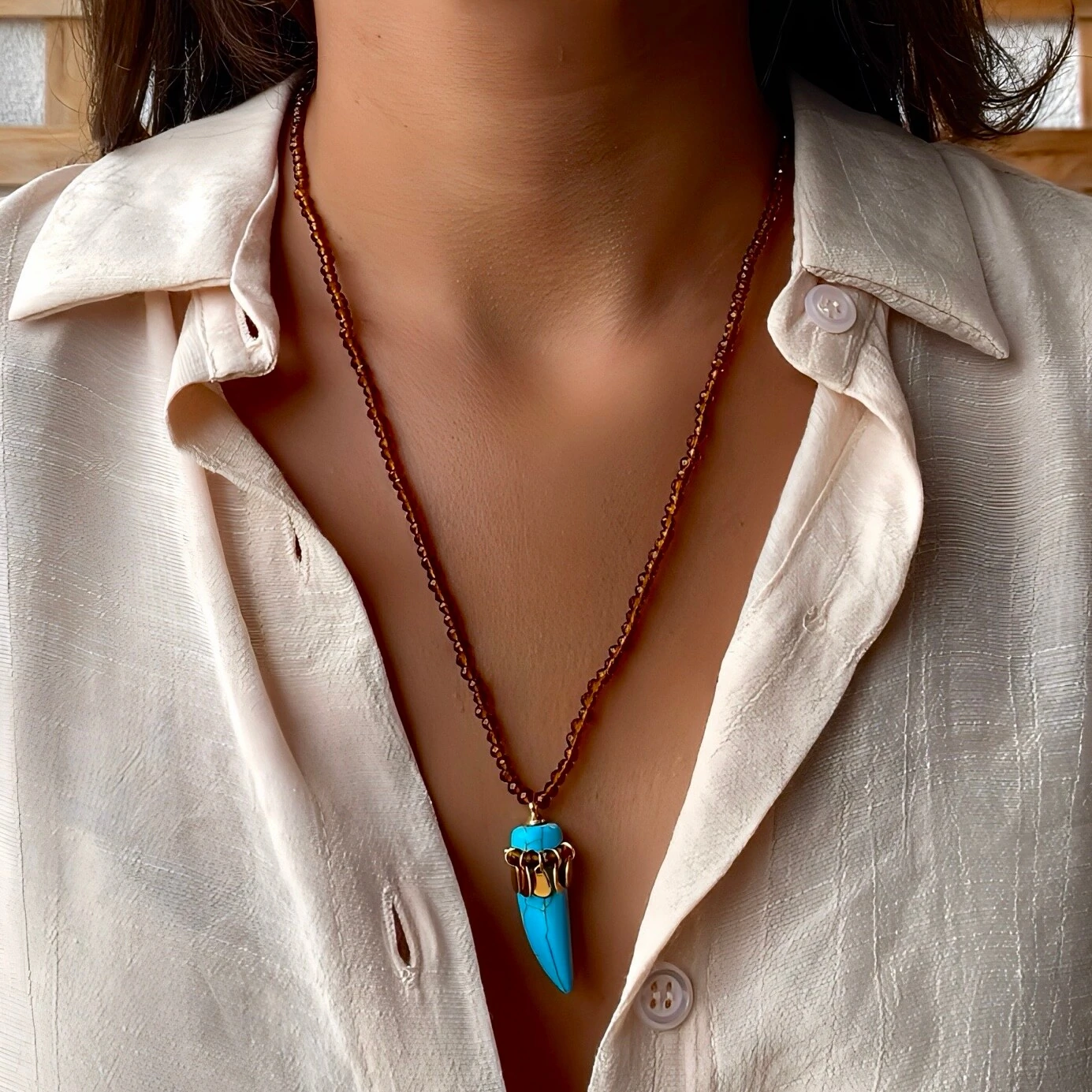 -30%Colar Dente Turquesa com Ágata Marrom e Cristal
